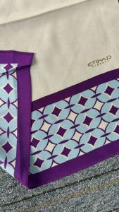 - Customization Requirements: The silk scarves need to be printed with custom patterns and the “Etihad” logo. The client emphasized that the pattern and logo printing must be clear, color-fast, and consistent with the brand image of Etihad Airways. After evaluating the requirements, we recommended digital printing technology to the client—this technology is especially suitable for custom silk scarves with complex patterns and precise logo requirements, as it can achieve high-definition printing effects, and the color saturation and durability are far superior to traditional printing methods.